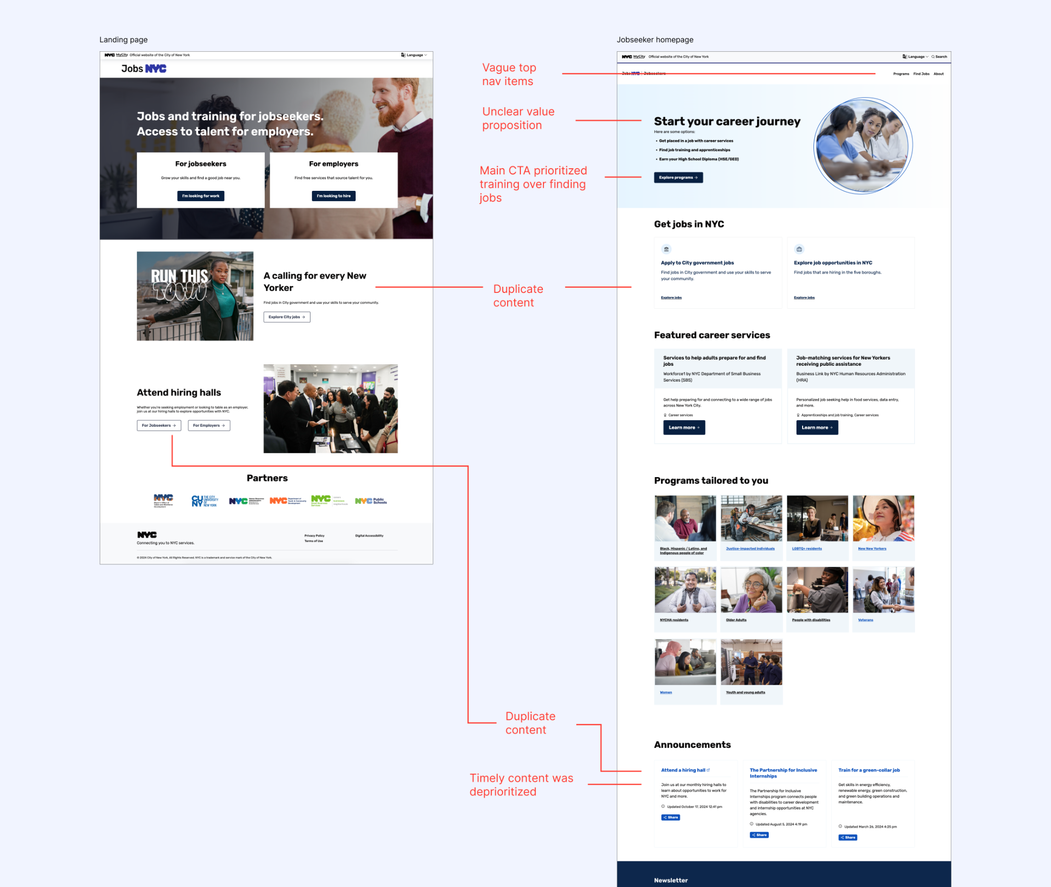 The site owners (Mayor's Office of Talent and Workforce Development) didn't have clear guidance on how to prioritize new content on the site. This meant they often added content to multiple parts of the site in order to "increase visibility". It got to the point where two primary pages along the funnel had similar content.